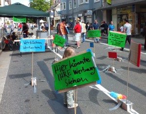 ming und dede besorgten frühmorgens den Aufbau (tmvp traf mal wieder erwartungsgemäß erst „cum tempore”, dafür aber mit Deko und massig selbst erstellten Flyern!) und richteten wie abgesprochen unsere große Versammlungs- und Aktionsfläche direkt vis à vis des pulsierenden Herzens des Stadtfestes, dem Rathausplatz, ein. Nur die schweren Fahrzeuge der (freiwilligen) Feuerwehr standen noch zwischen unserem Protest und den (noch) friedlich feiernden Menschen westlich unseres Hauptquatiers.