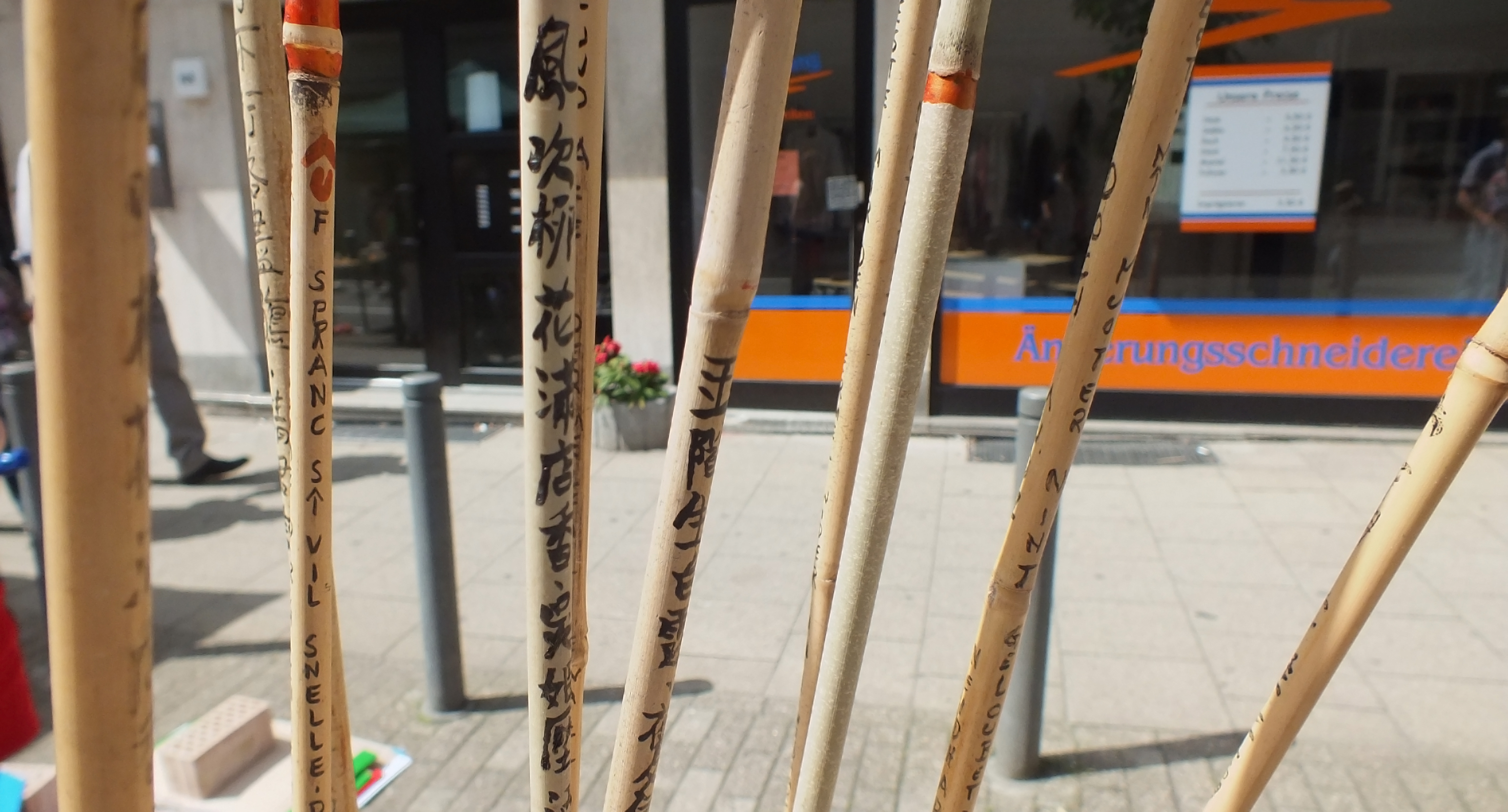 Schmale Bambusrohre, die in der Vergangenheit und Gegenwart aufgrund ihrer so vielseitigen Bedeutungsebenen schon so oft Material für Aktionen des kunstquadrat sind und waren, bekamen eine neue und ungewöhnliche Verwendung, indem ming diese Rörchen geschickt mit filligraner Kalligrafie versah. Sinnsprüche, Verse und Gedichte in historischen, asiatischen Zeichen zierten alsbald in schwarzer Tusche die Baubusrohre.